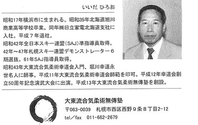 大東流の発展には、 人々にまず大東流を知ってもらうこと、 そして大東流側の構造改革」 幸道会修行時代、スキーインストラクターとしても 活躍、現在は、 札幌で大東流合気柔術無傳塾を主宰する 飯田宏雄(元幸道会札幌西支部長)の 北の国からの熱い発信である。